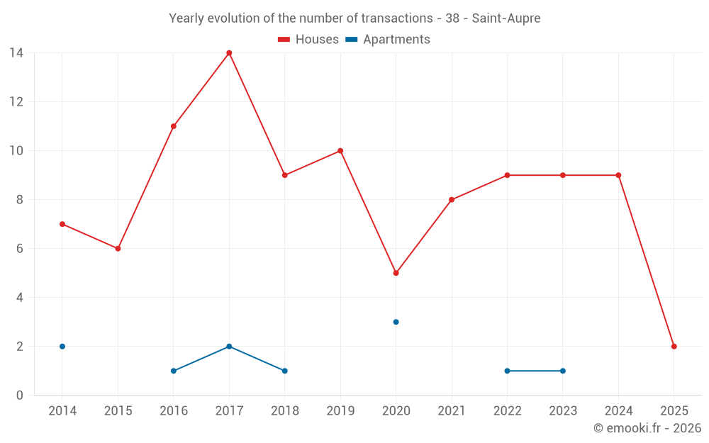 The median price on the 14 house transactions of the last 24 months in the municipality of Saint-Aupre was 2 482 € per square meter for a median property value of 282 250 €. Over this period, 60% of transactions were between 1 851 and 3 099 € per square meter (from the 2nd to the 8th deciles).