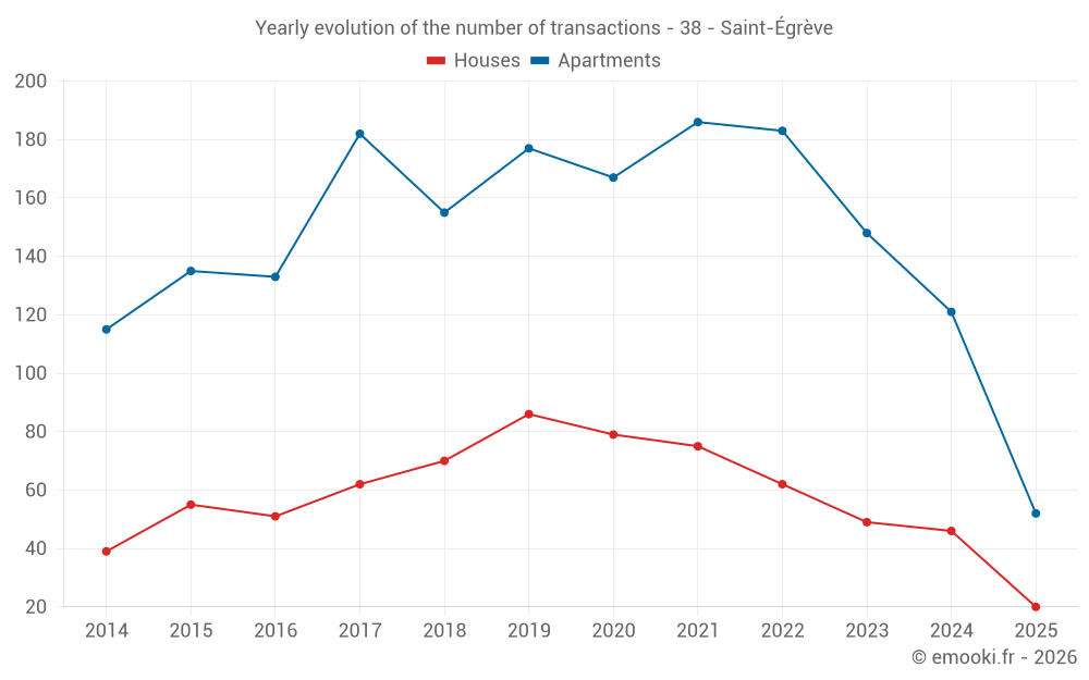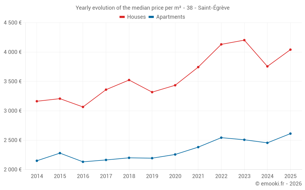 The median price on the 52 apartment transactions of the last 6 months in the municipality of Saint-Égrève was 2 612 € per square meter for a median property value of 204 000 €. Over this period, 60% of transactions were between 2 050 and 3 371 € per square meter (from the 2nd to the 8th deciles).