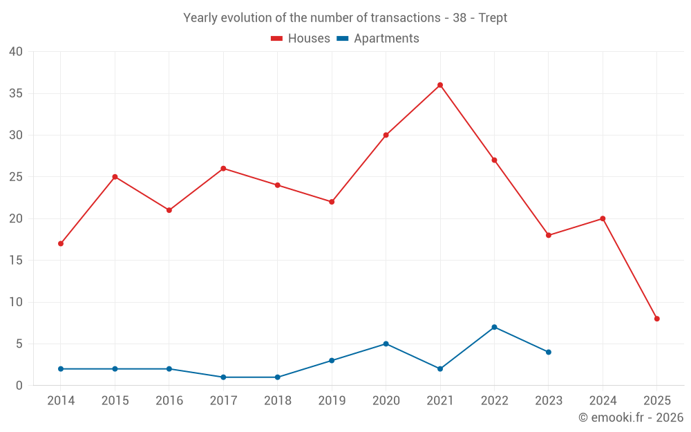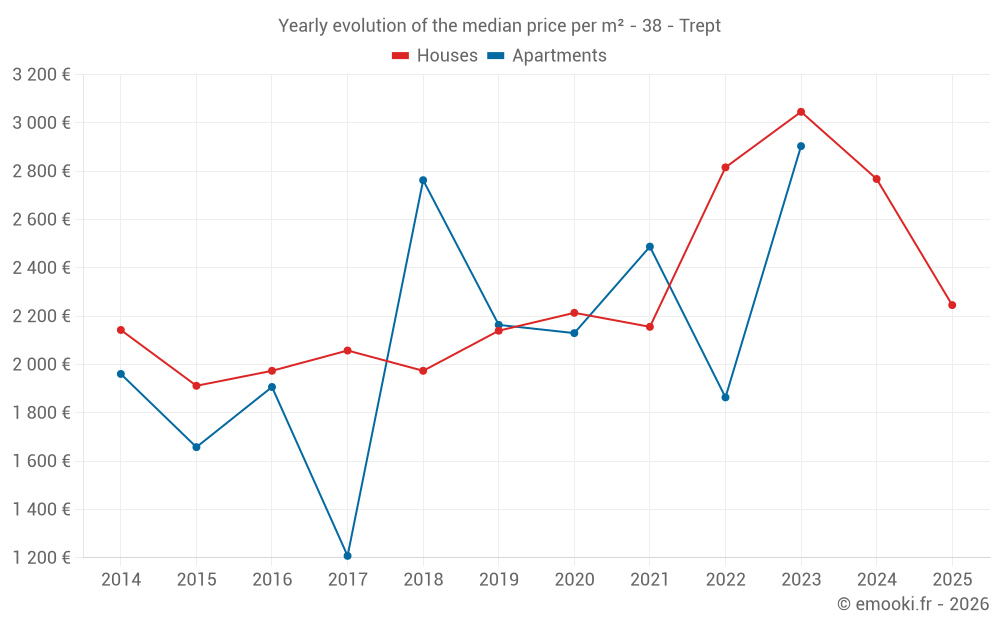 The median price on the 22 house transactions of the last 12 months in the municipality of Trept was 2 582 € per square meter for a median property value of 249 000 €. Over this period, 60% of transactions were between 2 027 and 3 637 € per square meter (from the 2nd to the 8th deciles).
