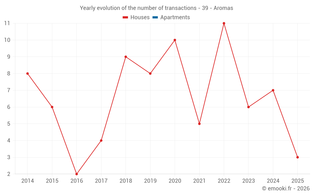 The median price on the 14 house transactions of the last 24 months in the municipality of Aromas was 1 415 € per square meter for a median property value of 154 500 €. Over this period, 60% of transactions were between 1 042 and 1 857 € per square meter (from the 2nd to the 8th deciles).