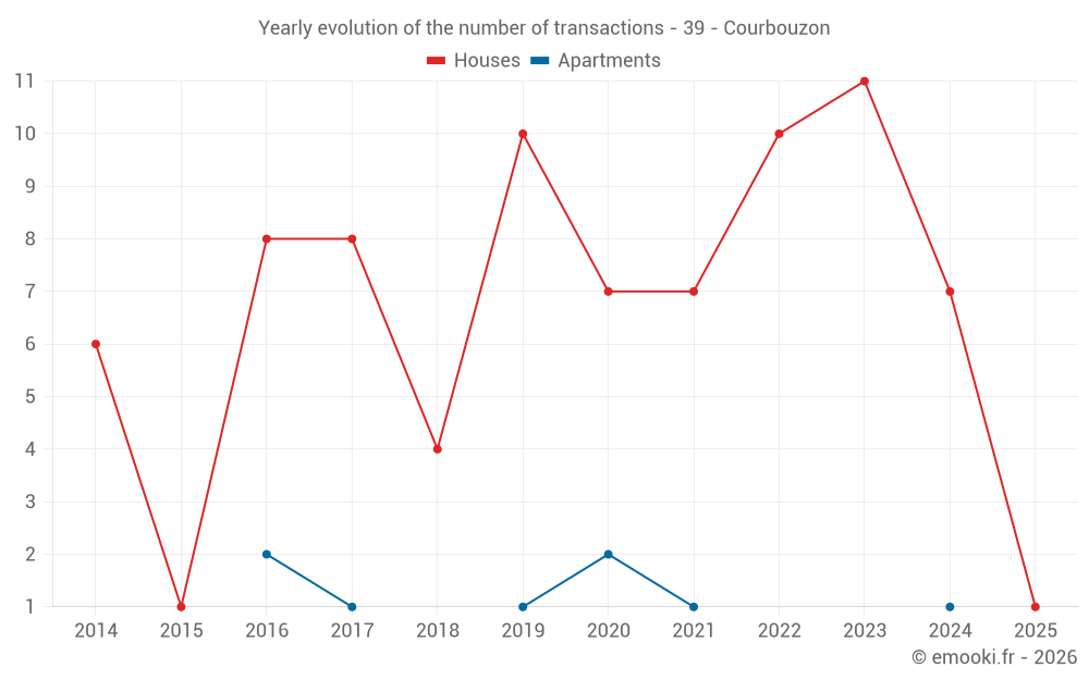 The median price on the 16 house transactions of the last 24 months in the municipality of Courbouzon was 1 697 € per square meter for a median property value of 179 125 €. Over this period, 60% of transactions were between 793 and 1 974 € per square meter (from the 2nd to the 8th deciles).