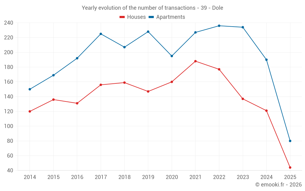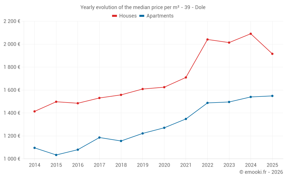 The median price on the 20 house transactions of the last 3 months in the municipality of Dole was 1 802 € per square meter for a median property value of 226 900 €. Over this period, 60% of transactions were between 1 353 and 2 452 € per square meter (from the 2nd to the 8th deciles).