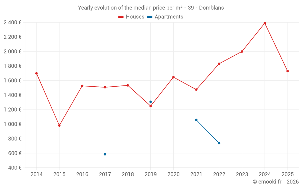 The median price on the 16 house transactions of the last 24 months in the municipality of Domblans was 2 120 € per square meter for a median property value of 220 290 €. Over this period, 60% of transactions were between 1 918 and 2 689 € per square meter (from the 2nd to the 8th deciles).