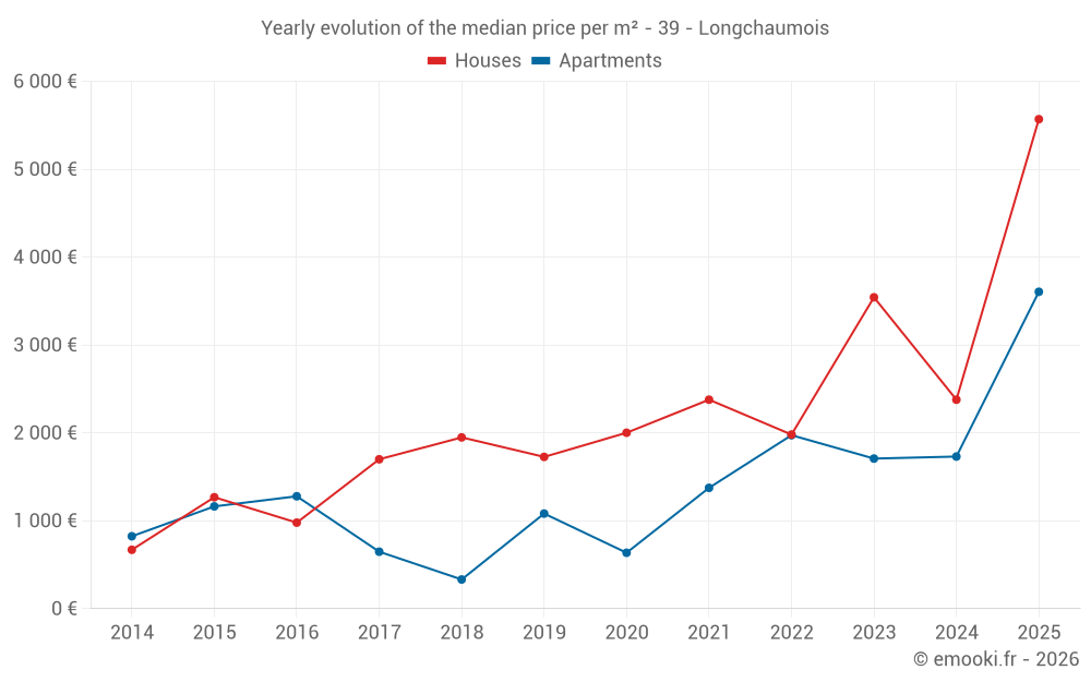 The median price on the 17 house transactions of the last 24 months in the municipality of Longchaumois was 2 649 € per square meter for a median property value of 230 000 €. Over this period, 60% of transactions were between 1 962 and 3 229 € per square meter (from the 2nd to the 8th deciles).