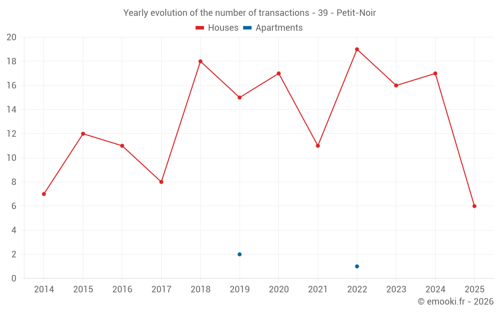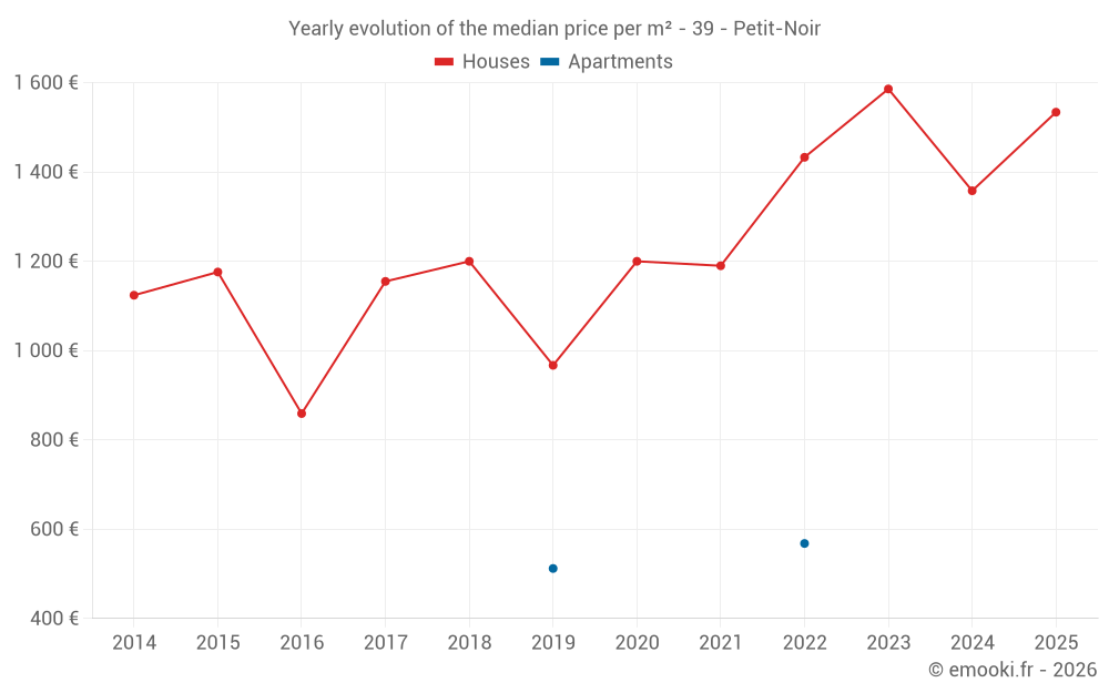 The median price on the 16 house transactions of the last 12 months in the municipality of Petit-Noir was 1 406 € per square meter for a median property value of 138 850 €. Over this period, 60% of transactions were between 1 039 and 1 695 € per square meter (from the 2nd to the 8th deciles).