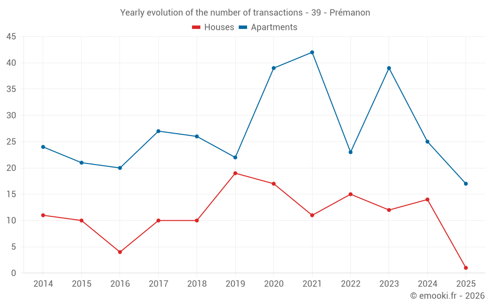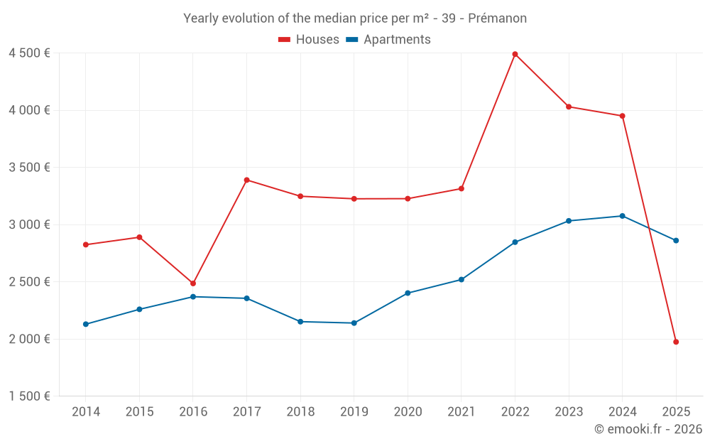 The median price on the 23 house transactions of the last 24 months in the municipality of Prémanon was 3 877 € per square meter for a median property value of 382 000 €. Over this period, 60% of transactions were between 3 239 and 4 889 € per square meter (from the 2nd to the 8th deciles).