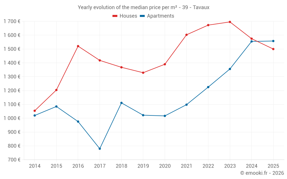 The median price on the 28 house transactions of the last 12 months in the municipality of Tavaux was 1 606 € per square meter for a median property value of 136 750 €. Over this period, 60% of transactions were between 1 339 and 1 973 € per square meter (from the 2nd to the 8th deciles).