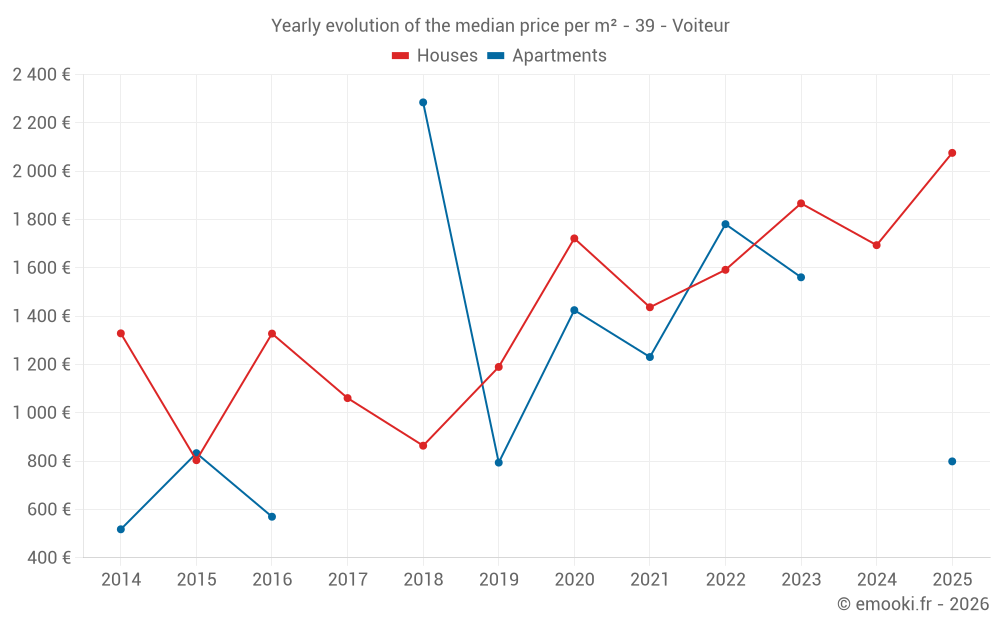 The median price on the 19 house transactions of the last 24 months in the municipality of Voiteur was 1 867 € per square meter for a median property value of 204 000 €. Over this period, 60% of transactions were between 1 033 and 2 230 € per square meter (from the 2nd to the 8th deciles).