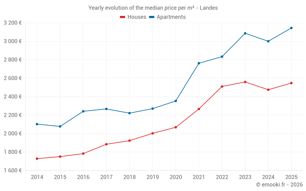 The median price on the 384 apartment transactions of the last 3 months in the Landes department was 2 989 € per square meter for a median property value of 155 000 €. Over this period, 60% of transactions were between 2 118 and 4 992 € per square meter (from the 2nd to the 8th deciles).