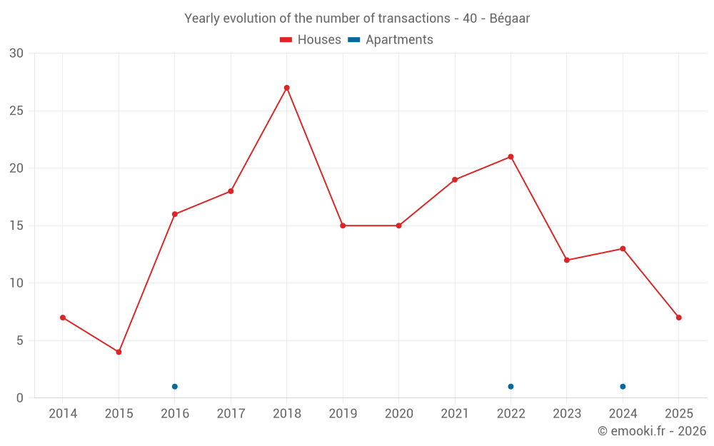 The median price on the 17 house transactions of the last 12 months in the municipality of Bégaar was 1 710 € per square meter for a median property value of 181 211 €. Over this period, 60% of transactions were between 1 531 and 2 128 € per square meter (from the 2nd to the 8th deciles).