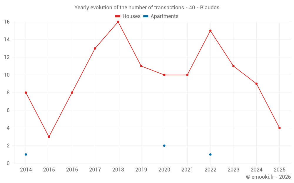 The median price on the 18 house transactions of the last 24 months in the municipality of Biaudos was 3 346 € per square meter for a median property value of 404 035 €. Over this period, 60% of transactions were between 2 560 and 3 994 € per square meter (from the 2nd to the 8th deciles).