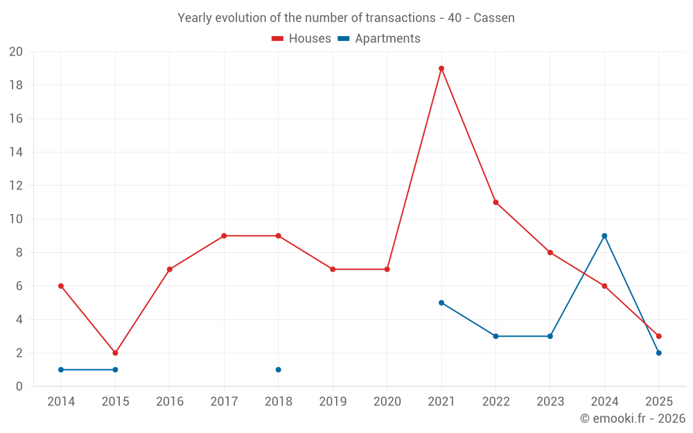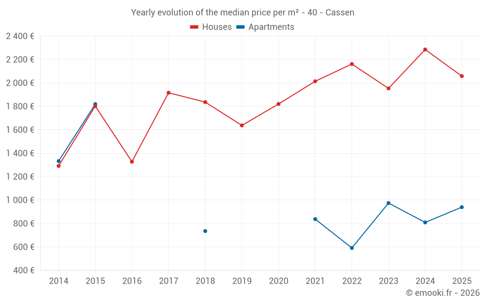 The median price on the 15 house transactions of the last 24 months in the municipality of Cassen was 2 130 € per square meter for a median property value of 236 500 €. Over this period, 60% of transactions were between 1 924 and 2 478 € per square meter (from the 2nd to the 8th deciles).