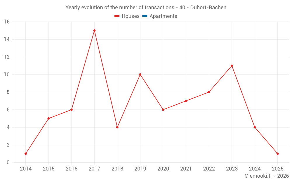 Real estate price map in the municipality of Duhort-Bachen, choose a section to see transactions by parcel.
