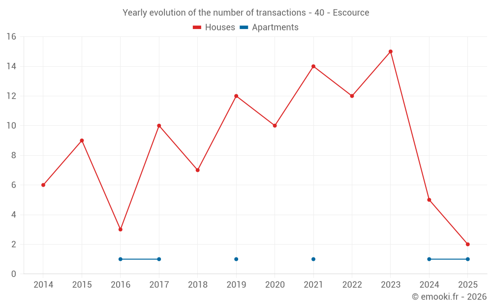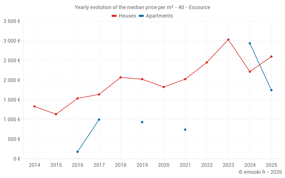 The median price on the 14 house transactions of the last 24 months in the municipality of Escource was 2 457 € per square meter for a median property value of 220 783 €. Over this period, 60% of transactions were between 2 047 and 3 108 € per square meter (from the 2nd to the 8th deciles).