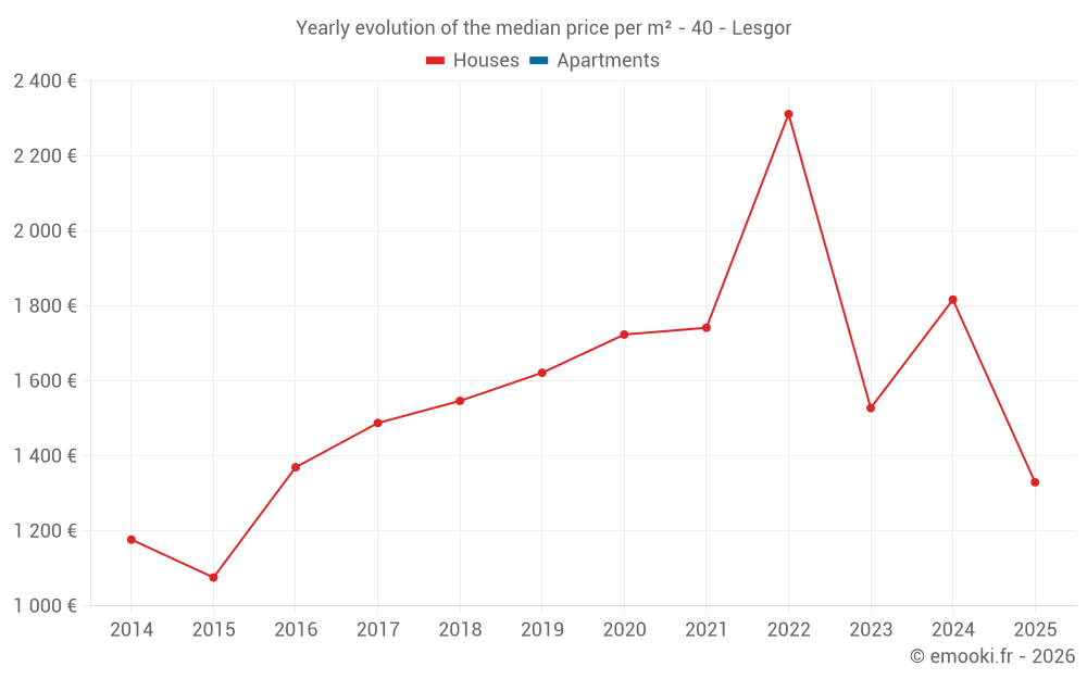 The median price on the 14 house transactions of the last 24 months in the municipality of Lesgor was 1 718 € per square meter for a median property value of 189 000 €. Over this period, 60% of transactions were between 1 378 and 2 162 € per square meter (from the 2nd to the 8th deciles).