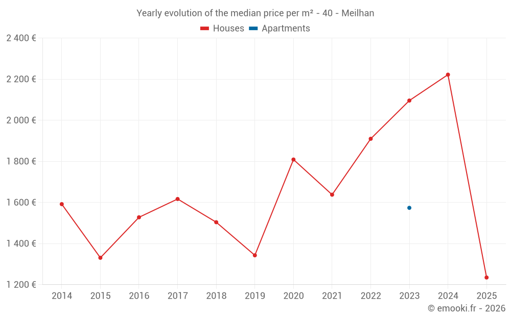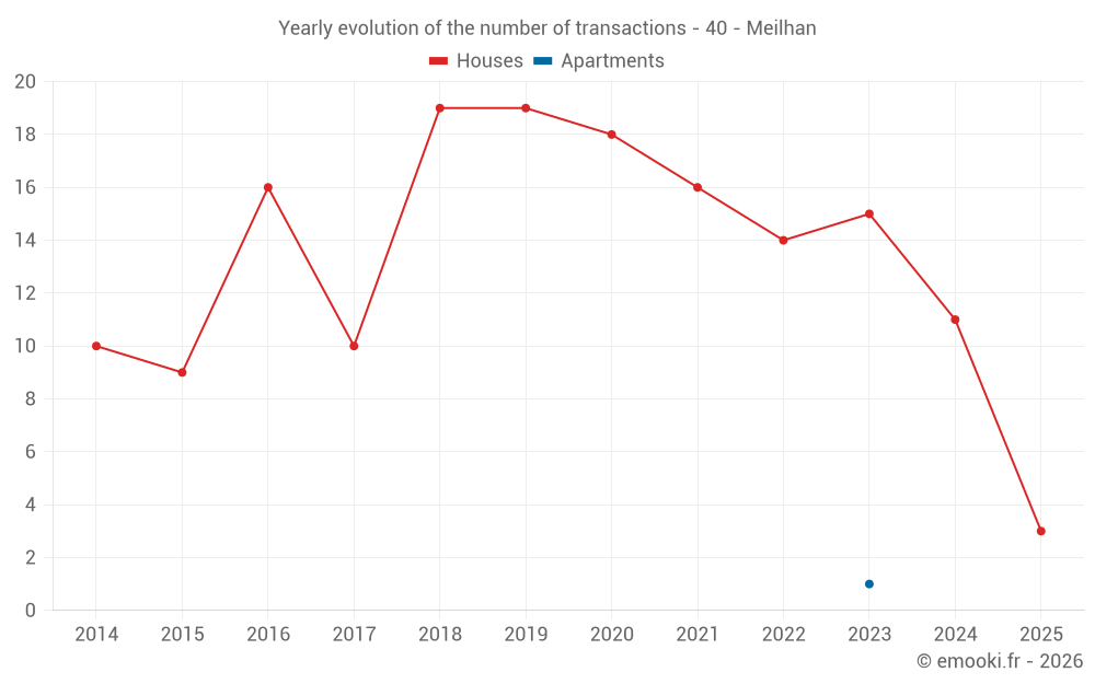 The median price on the 21 house transactions of the last 24 months in the municipality of Meilhan was 1 875 € per square meter for a median property value of 184 800 €. Over this period, 60% of transactions were between 1 365 and 2 432 € per square meter (from the 2nd to the 8th deciles).