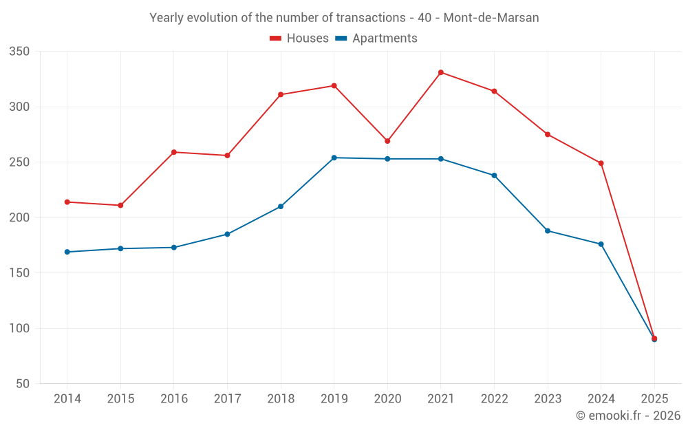 The median price on the 39 house transactions of the last 3 months in the municipality of Mont-de-Marsan was 2 089 € per square meter for a median property value of 178 000 €. Over this period, 60% of transactions were between 1 563 and 2 444 € per square meter (from the 2nd to the 8th deciles).