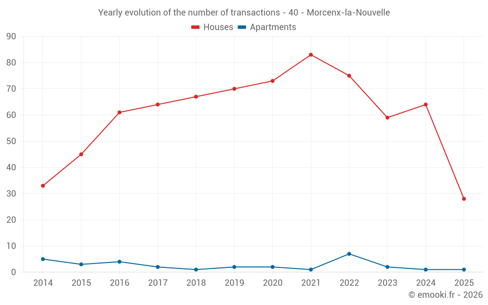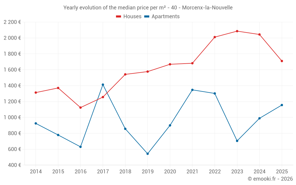 The median price on the 28 house transactions of the last 6 months in the municipality of Morcenx-la-Nouvelle was 1 710 € per square meter for a median property value of 159 850 €. Over this period, 60% of transactions were between 1 466 and 2 288 € per square meter (from the 2nd to the 8th deciles).