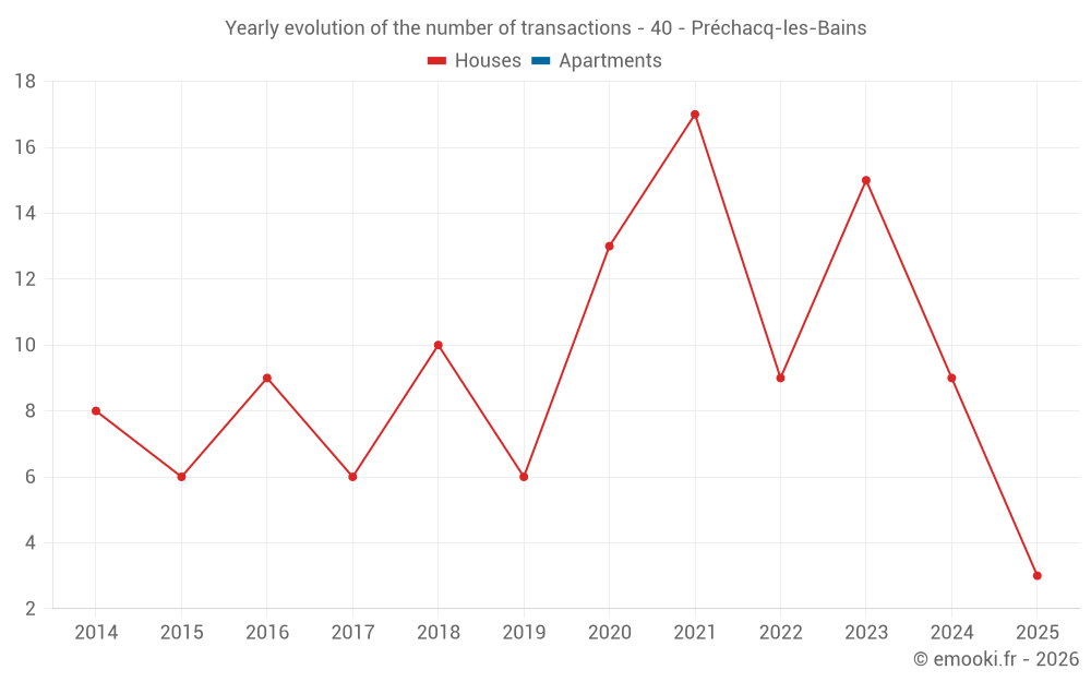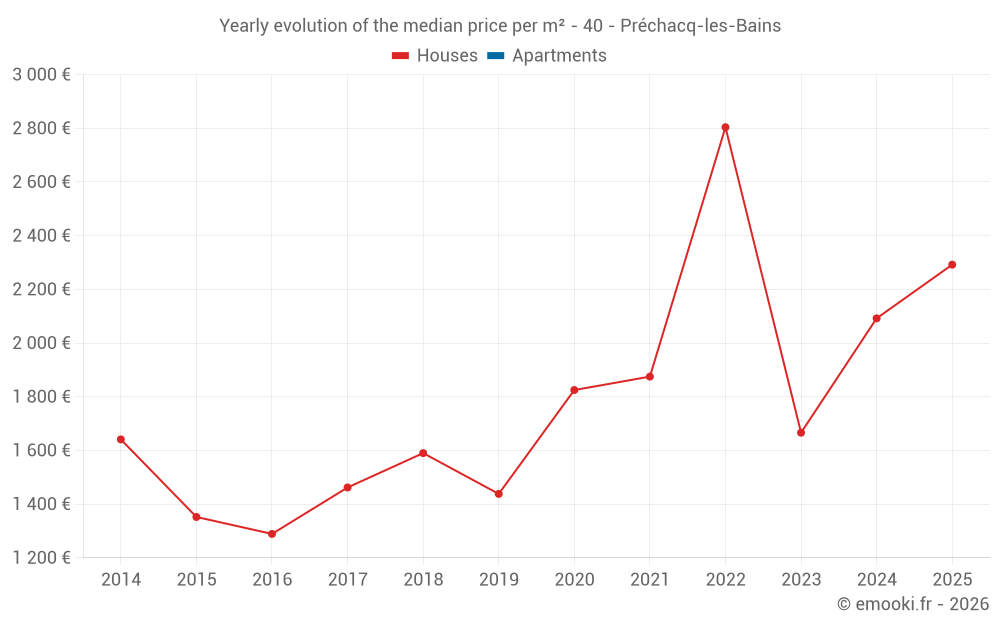 The median price on the 20 house transactions of the last 24 months in the municipality of Préchacq-les-Bains was 1 632 € per square meter for a median property value of 192 750 €. Over this period, 60% of transactions were between 1 260 and 2 310 € per square meter (from the 2nd to the 8th deciles).
