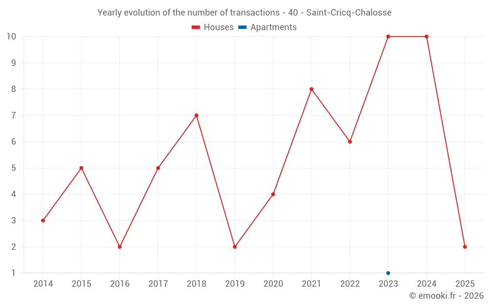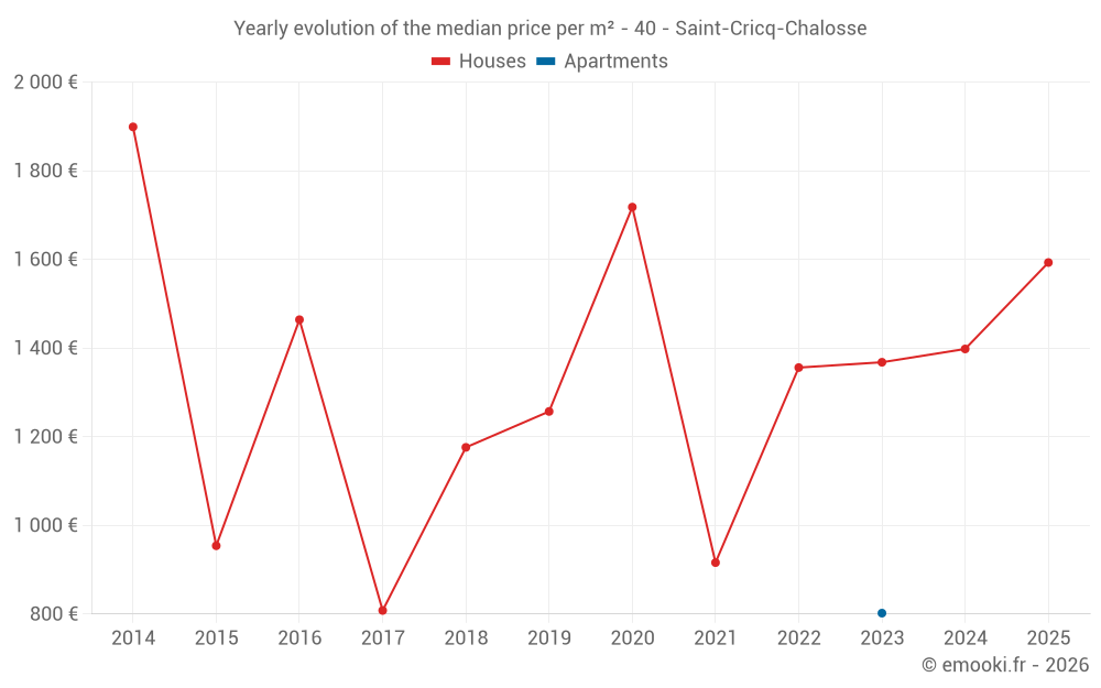 The median price on the 18 house transactions of the last 24 months in the municipality of Saint-Cricq-Chalosse was 1 299 € per square meter for a median property value of 124 500 €. Over this period, 60% of transactions were between 843 and 1 907 € per square meter (from the 2nd to the 8th deciles).