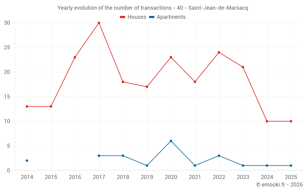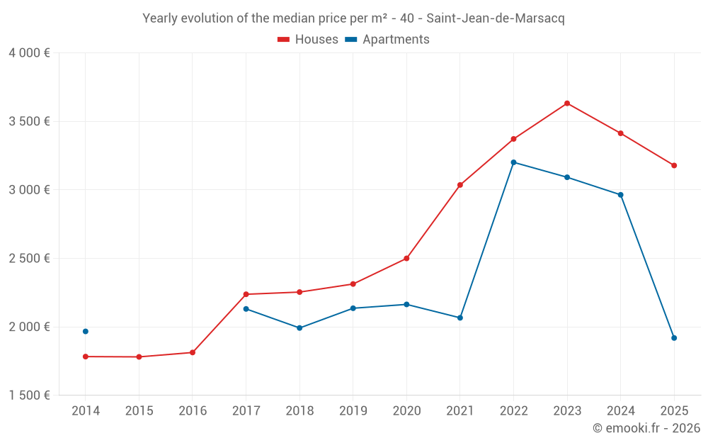 The median price on the 17 house transactions of the last 12 months in the municipality of Saint-Jean-de-Marsacq was 3 326 € per square meter for a median property value of 340 000 €. Over this period, 60% of transactions were between 2 628 and 4 001 € per square meter (from the 2nd to the 8th deciles).