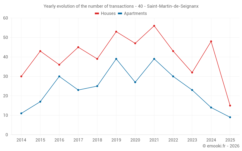 The median price on the 46 house transactions of the last 12 months in the municipality of Saint-Martin-de-Seignanx was 4 010 € per square meter for a median property value of 412 000 €. Over this period, 60% of transactions were between 2 883 and 4 658 € per square meter (from the 2nd to the 8th deciles).