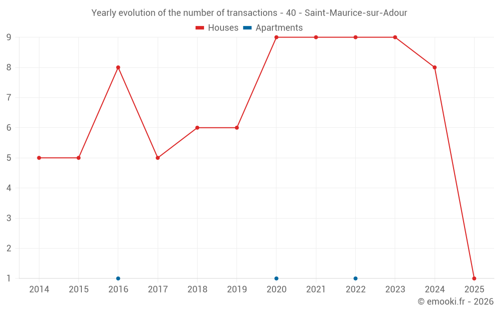 The median price on the 15 house transactions of the last 24 months in the municipality of Saint-Maurice-sur-Adour was 1 918 € per square meter for a median property value of 209 500 €. Over this period, 60% of transactions were between 1 460 and 2 281 € per square meter (from the 2nd to the 8th deciles).