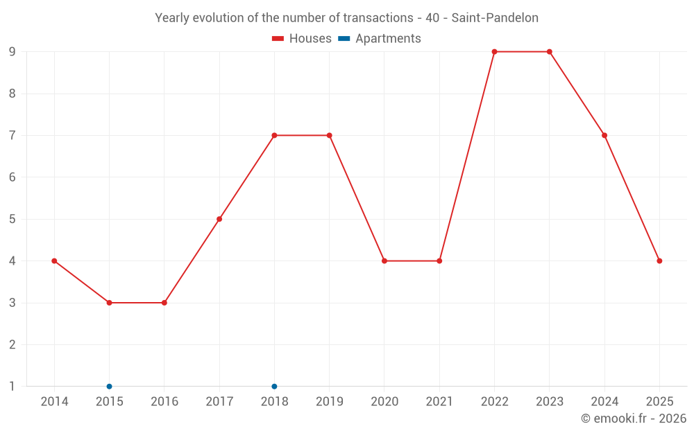 The median price on the 19 house transactions of the last 24 months in the municipality of Saint-Pandelon was 2 665 € per square meter for a median property value of 274 100 €. Over this period, 60% of transactions were between 1 706 and 2 967 € per square meter (from the 2nd to the 8th deciles).