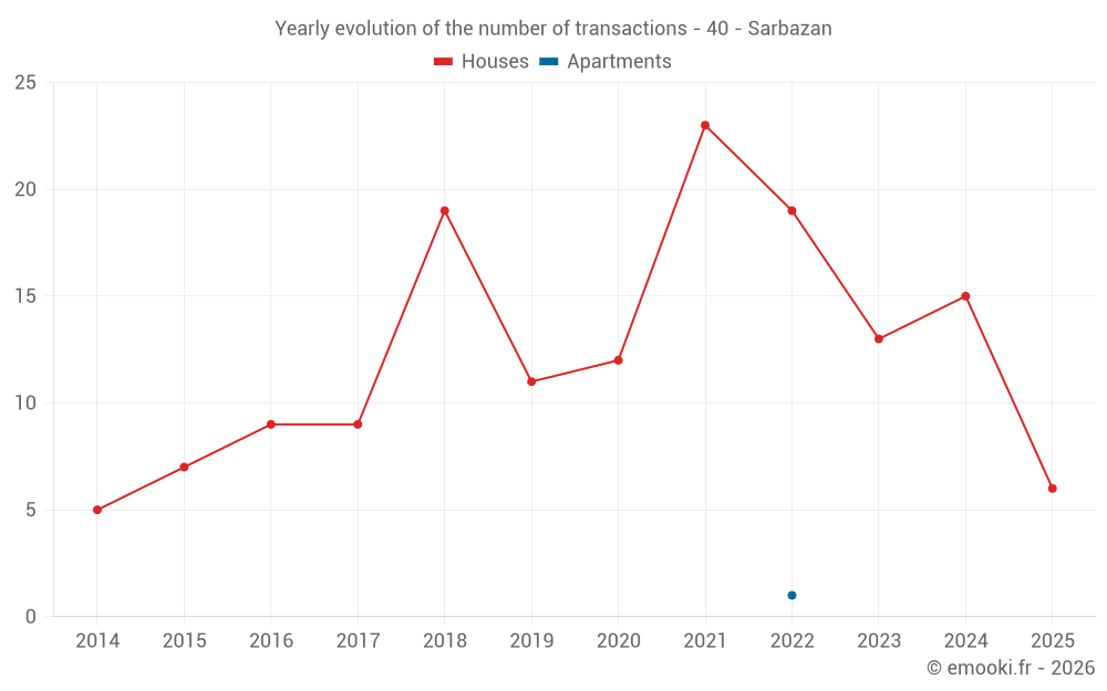 The median price on the 30 house transactions of the last 24 months in the municipality of Sarbazan was 1 692 € per square meter for a median property value of 151 000 €. Over this period, 60% of transactions were between 1 390 and 1 866 € per square meter (from the 2nd to the 8th deciles).
