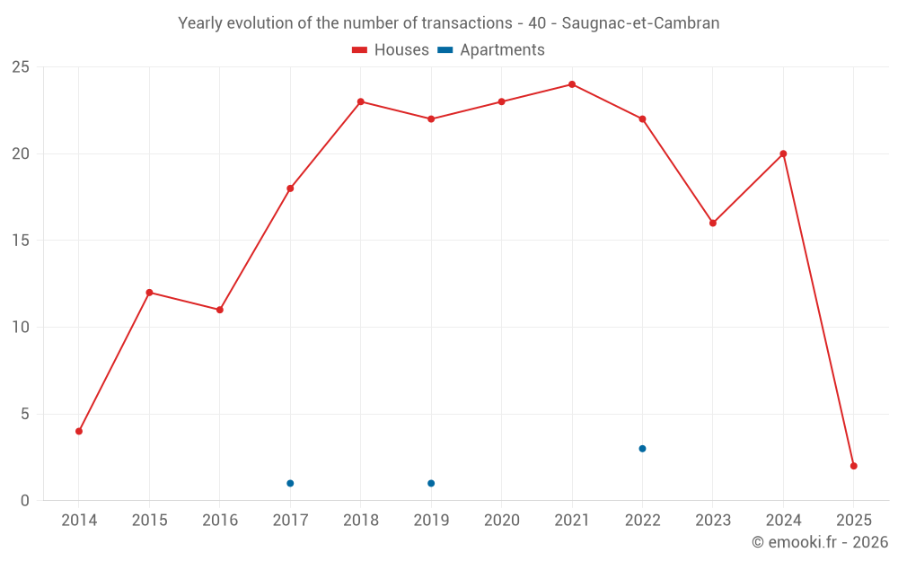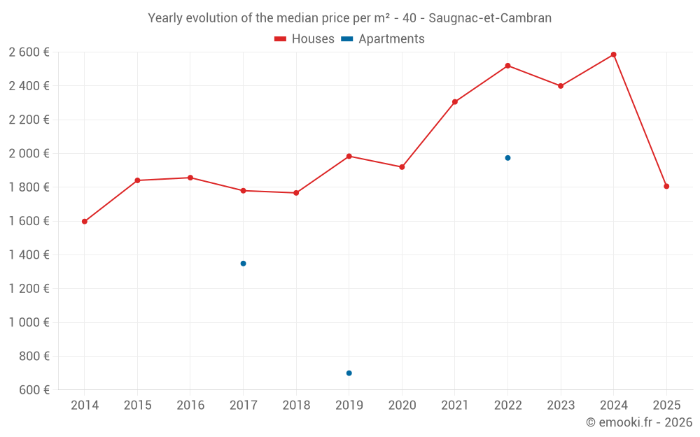 The median price on the 30 house transactions of the last 24 months in the municipality of Saugnac-et-Cambran was 2 536 € per square meter for a median property value of 278 250 €. Over this period, 60% of transactions were between 1 730 and 3 094 € per square meter (from the 2nd to the 8th deciles).