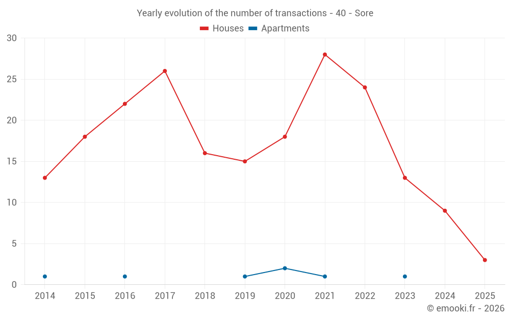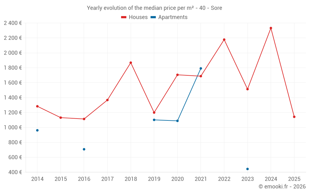 The median price on the 19 house transactions of the last 24 months in the municipality of Sore was 1 974 € per square meter for a median property value of 210 000 €. Over this period, 60% of transactions were between 1 097 and 2 568 € per square meter (from the 2nd to the 8th deciles).
