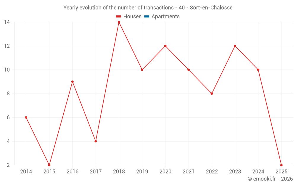The median price on the 19 house transactions of the last 24 months in the municipality of Sort-en-Chalosse was 2 000 € per square meter for a median property value of 212 000 €. Over this period, 60% of transactions were between 1 173 and 2 679 € per square meter (from the 2nd to the 8th deciles).