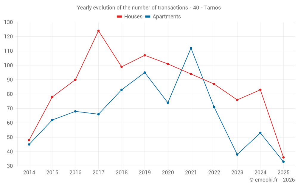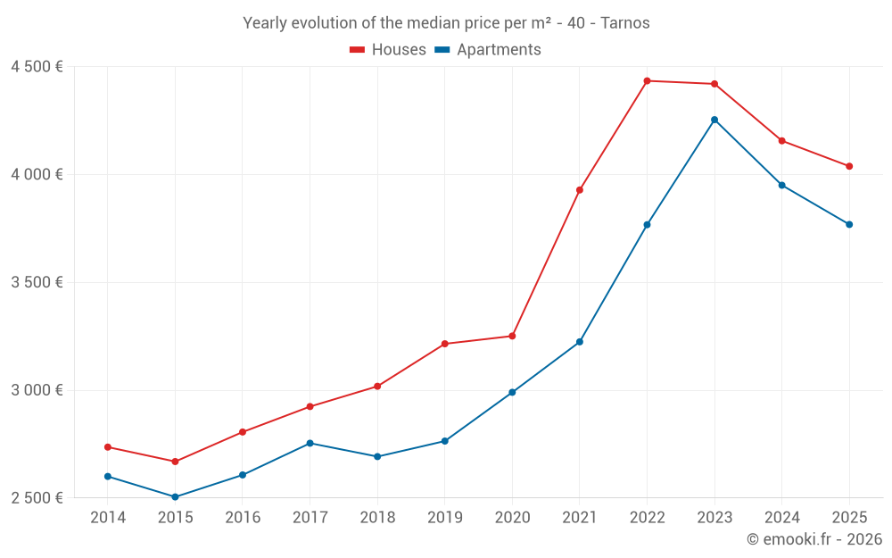 The median price on the 33 apartment transactions of the last 6 months in the municipality of Tarnos was 3 768 € per square meter for a median property value of 205 300 €. Over this period, 60% of transactions were between 3 047 and 4 421 € per square meter (from the 2nd to the 8th deciles).