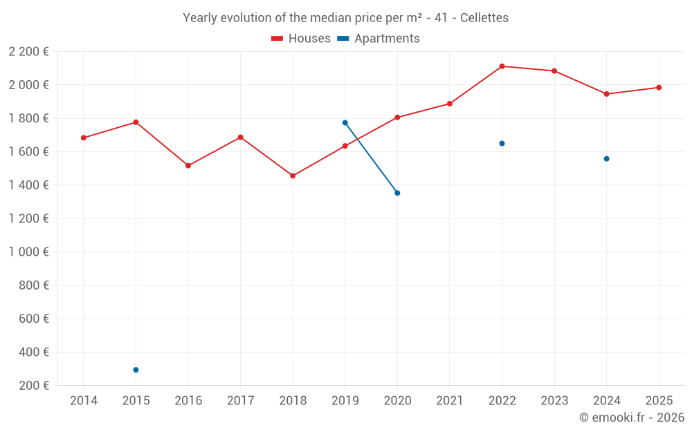 The median price on the 23 house transactions of the last 12 months in the municipality of Cellettes was 1 946 € per square meter for a median property value of 207 000 €. Over this period, 60% of transactions were between 1 470 and 2 148 € per square meter (from the 2nd to the 8th deciles).
