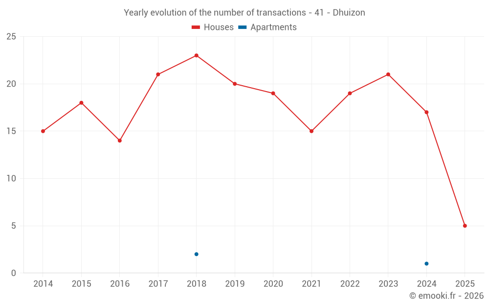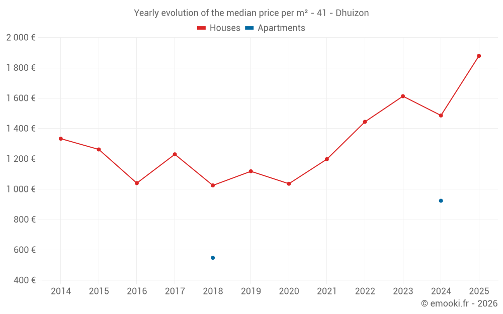 The median price on the 33 house transactions of the last 24 months in the municipality of Dhuizon was 1 731 € per square meter for a median property value of 135 000 €. Over this period, 60% of transactions were between 1 113 and 2 117 € per square meter (from the 2nd to the 8th deciles).