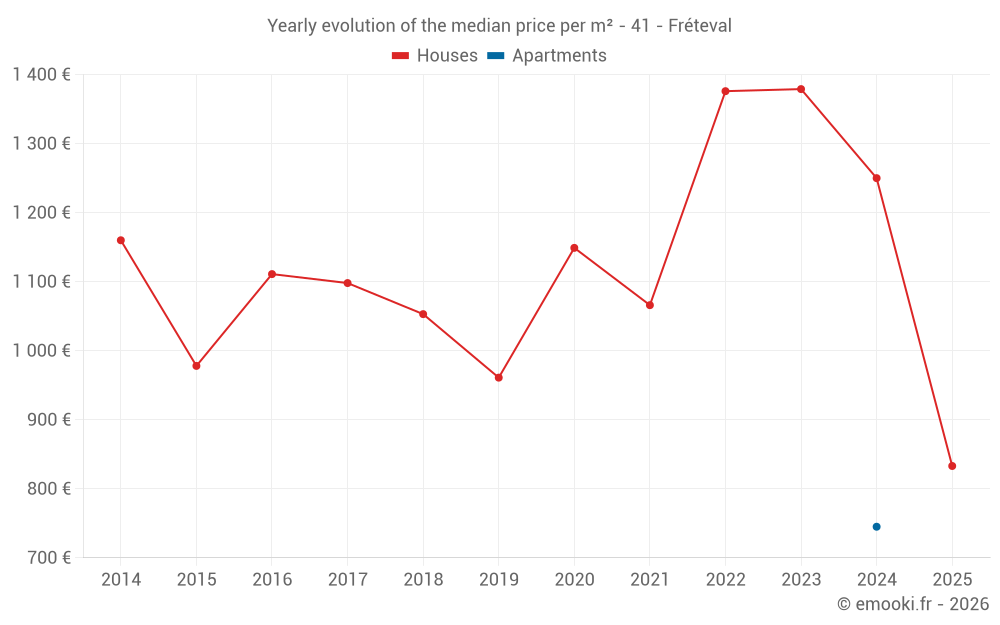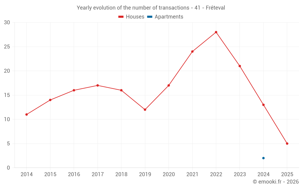 The median price on the 28 house transactions of the last 24 months in the municipality of Fréteval was 1 238 € per square meter for a median property value of 97 400 €. Over this period, 60% of transactions were between 823 and 1 831 € per square meter (from the 2nd to the 8th deciles).