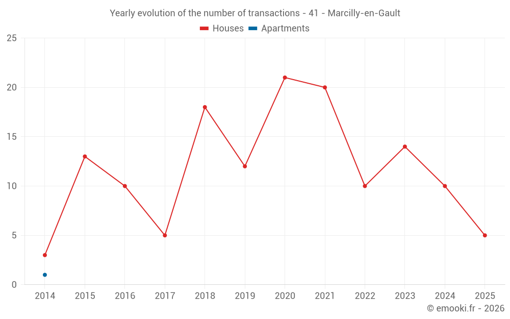 The median price on the 19 house transactions of the last 24 months in the municipality of Marcilly-en-Gault was 1 335 € per square meter for a median property value of 140 000 €. Over this period, 60% of transactions were between 712 and 1 733 € per square meter (from the 2nd to the 8th deciles).