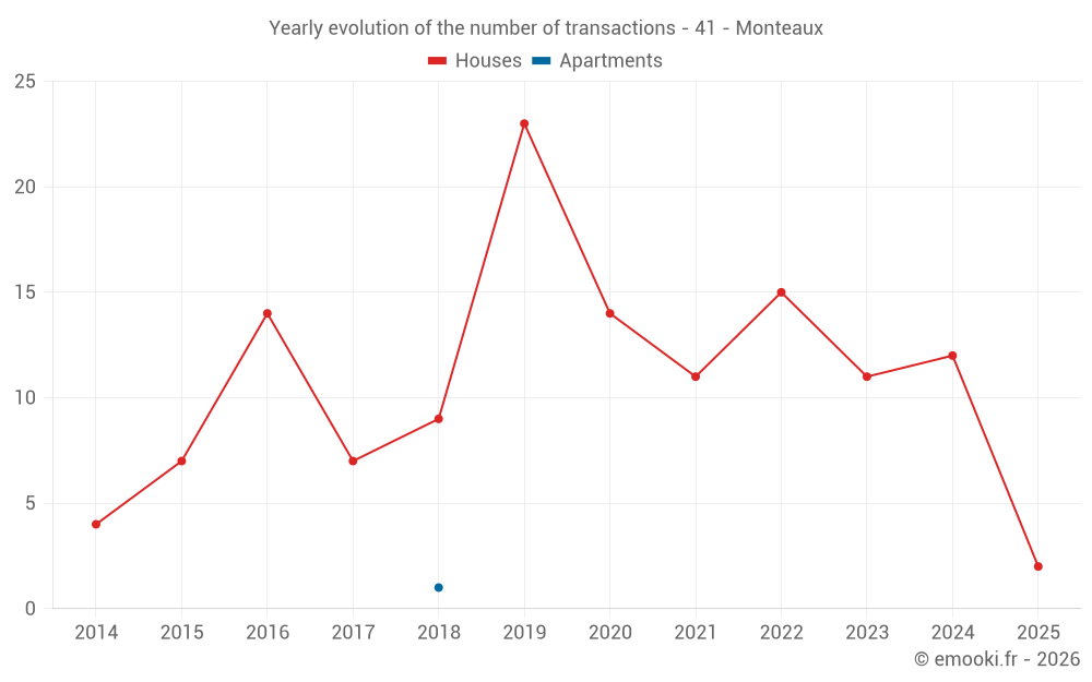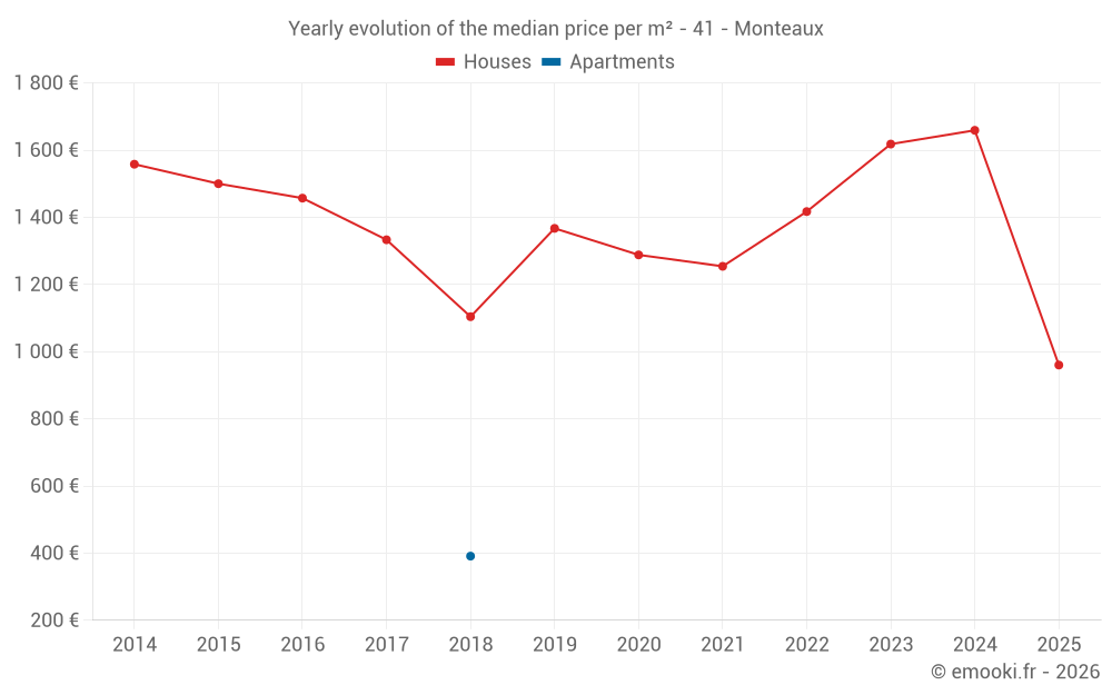 The median price on the 20 house transactions of the last 24 months in the municipality of Monteaux was 1 659 € per square meter for a median property value of 120 000 €. Over this period, 60% of transactions were between 1 224 and 1 886 € per square meter (from the 2nd to the 8th deciles).