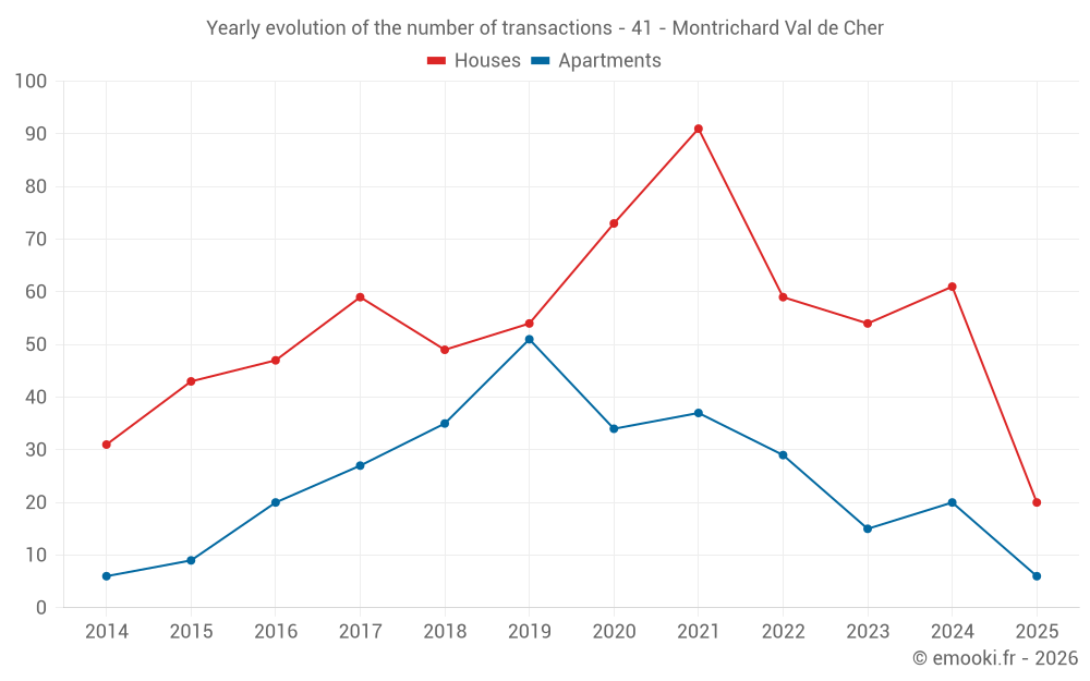 The median price on the 20 house transactions of the last 6 months in the municipality of Montrichard Val de Cher was 1 516 € per square meter for a median property value of 129 000 €. Over this period, 60% of transactions were between 1 033 and 1 857 € per square meter (from the 2nd to the 8th deciles).