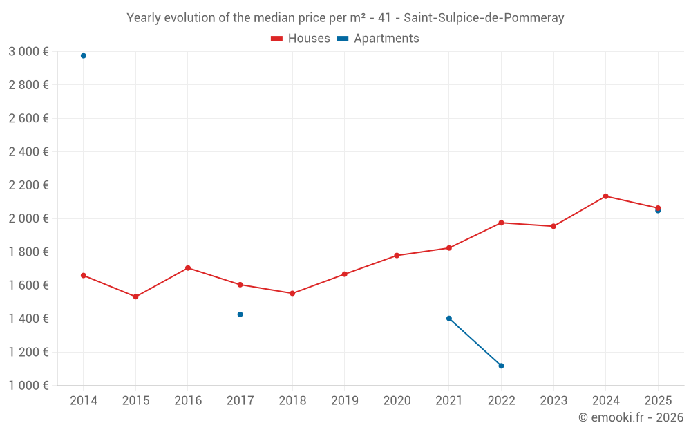 The median price on the 24 house transactions of the last 24 months in the municipality of Saint-Sulpice-de-Pommeray was 2 071 € per square meter for a median property value of 185 475 €. Over this period, 60% of transactions were between 1 533 and 2 326 € per square meter (from the 2nd to the 8th deciles).