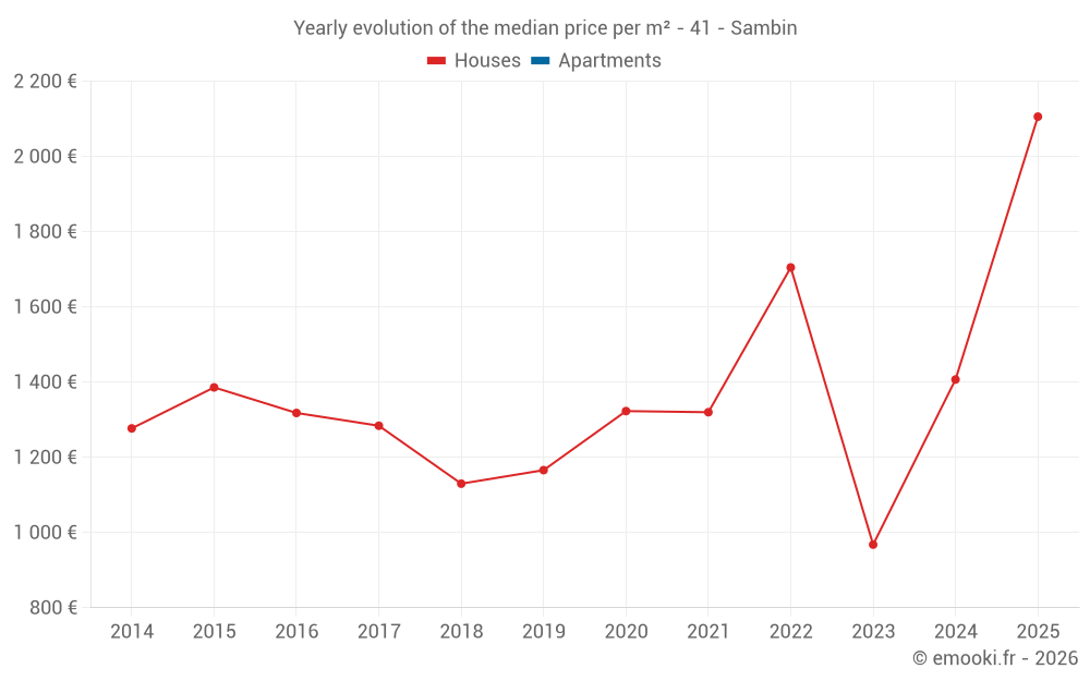 The median price on the 19 house transactions of the last 24 months in the municipality of Sambin was 1 367 € per square meter for a median property value of 128 500 €. Over this period, 60% of transactions were between 659 and 1 864 € per square meter (from the 2nd to the 8th deciles).