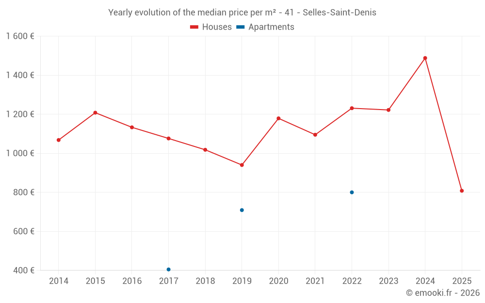 The median price on the 29 house transactions of the last 24 months in the municipality of Selles-Saint-Denis was 1 386 € per square meter for a median property value of 131 000 €. Over this period, 60% of transactions were between 799 and 1 878 € per square meter (from the 2nd to the 8th deciles).