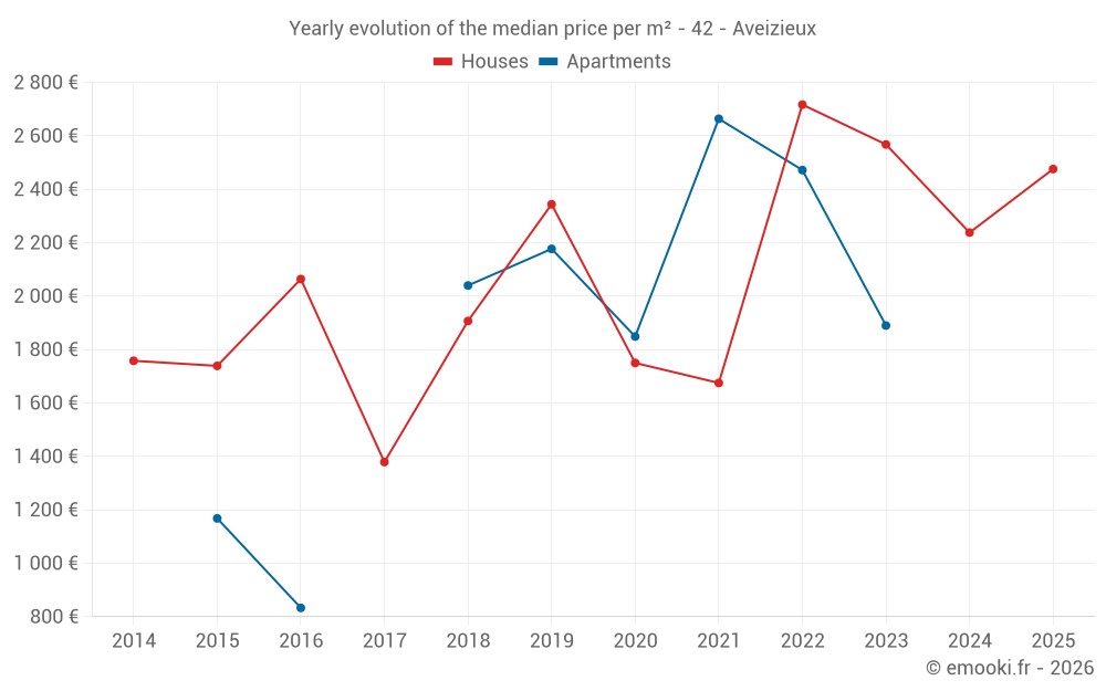 The median price on the 18 house transactions of the last 12 months in the municipality of Aveizieux was 2 476 € per square meter for a median property value of 244 300 €. Over this period, 60% of transactions were between 1 563 and 2 785 € per square meter (from the 2nd to the 8th deciles).