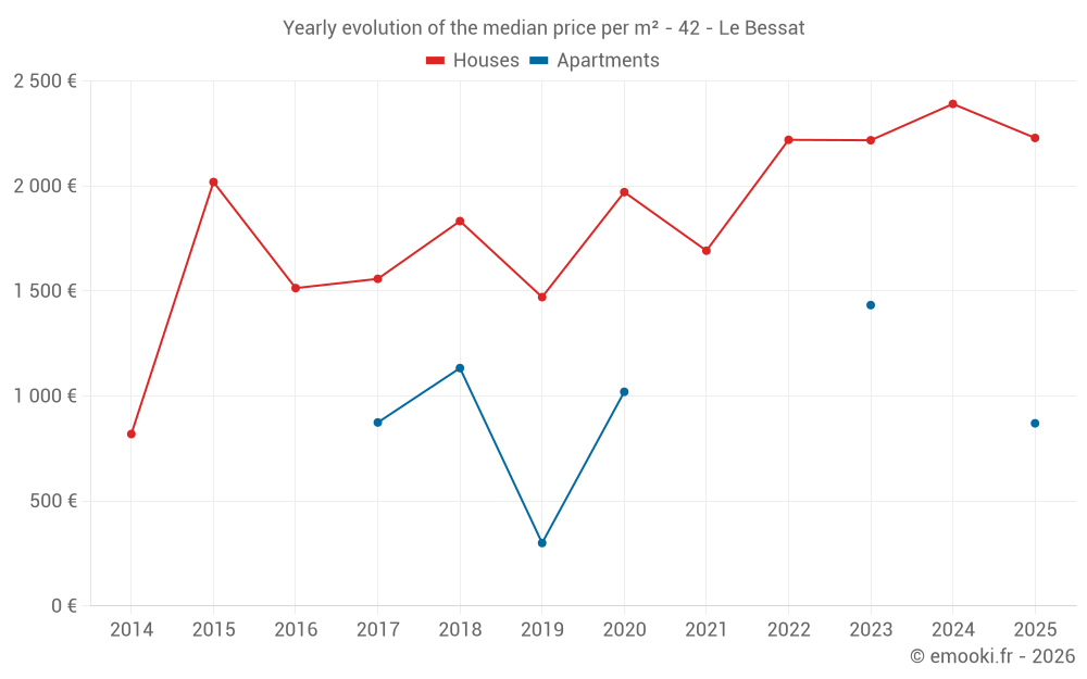 The median price on the 17 house transactions of the last 24 months in the municipality of Le Bessat was 2 302 € per square meter for a median property value of 243 000 €. Over this period, 60% of transactions were between 1 584 and 3 416 € per square meter (from the 2nd to the 8th deciles).