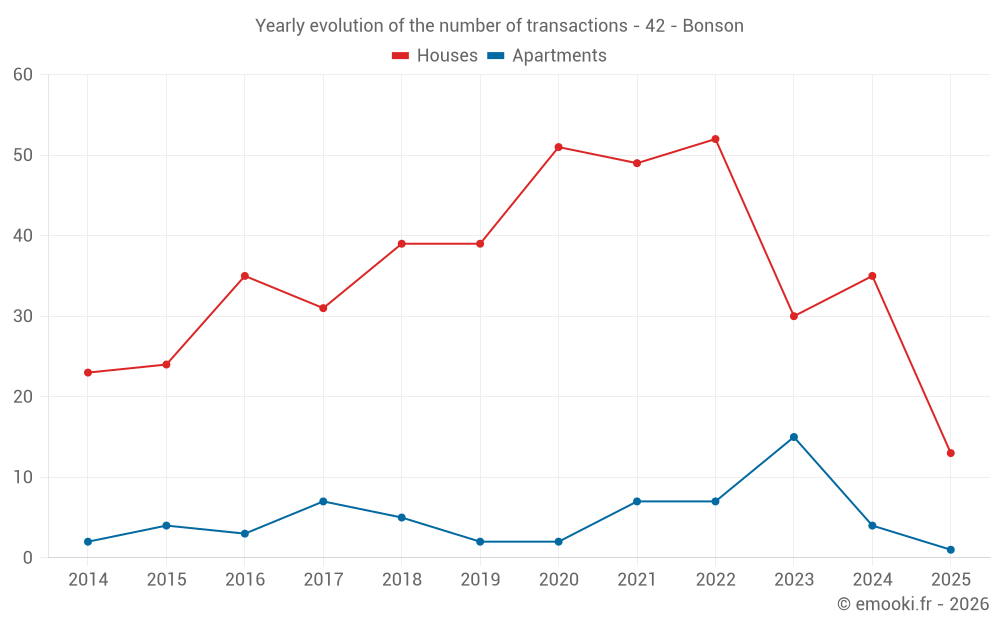 The median price on the 16 apartment transactions of the last 24 months in the municipality of Bonson was 2 363 € per square meter for a median property value of 182 000 €. Over this period, 60% of transactions were between 2 272 and 2 498 € per square meter (from the 2nd to the 8th deciles).