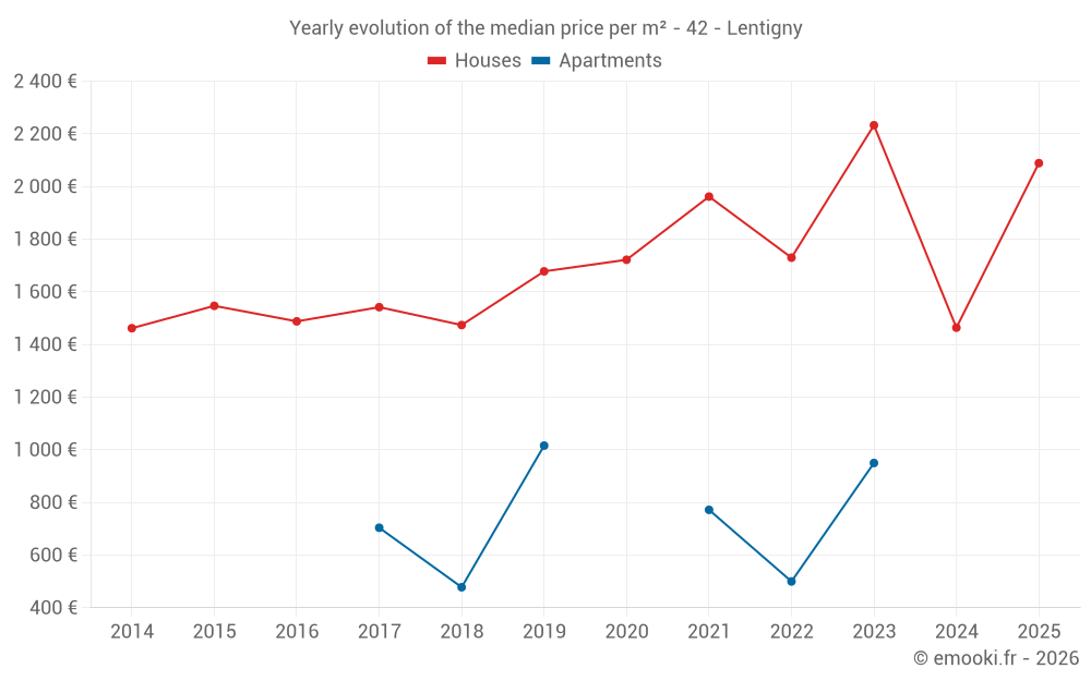 The median price on the 25 house transactions of the last 24 months in the municipality of Lentigny was 2 089 € per square meter for a median property value of 206 800 €. Over this period, 60% of transactions were between 1 398 and 2 593 € per square meter (from the 2nd to the 8th deciles).