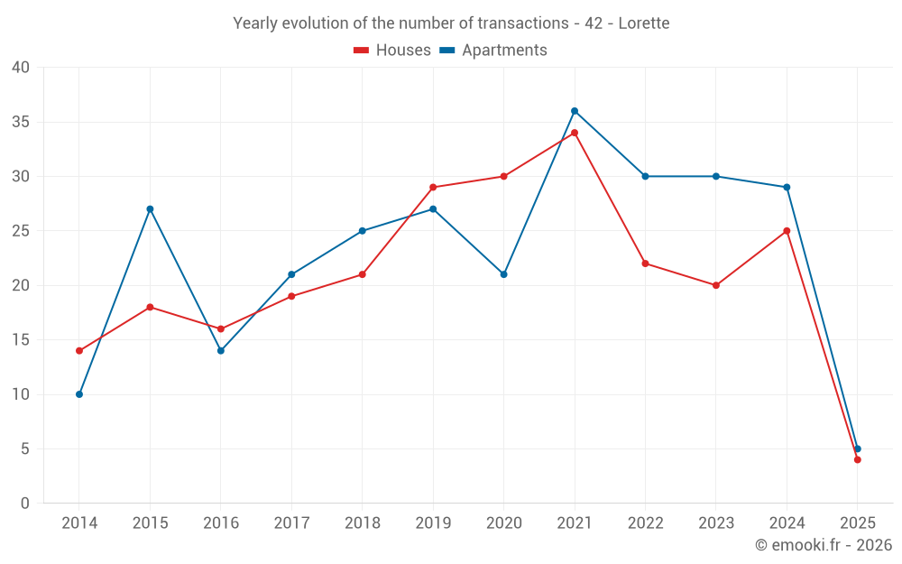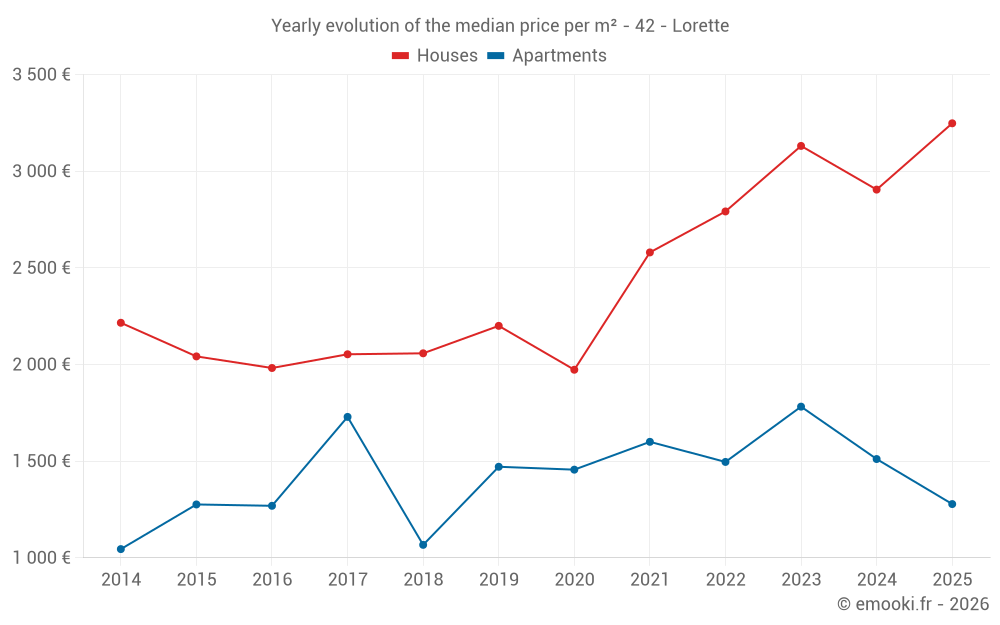 The median price on the 39 house transactions of the last 24 months in the municipality of Lorette was 2 928 € per square meter for a median property value of 246 210 €. Over this period, 60% of transactions were between 2 261 and 3 314 € per square meter (from the 2nd to the 8th deciles).