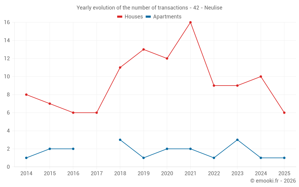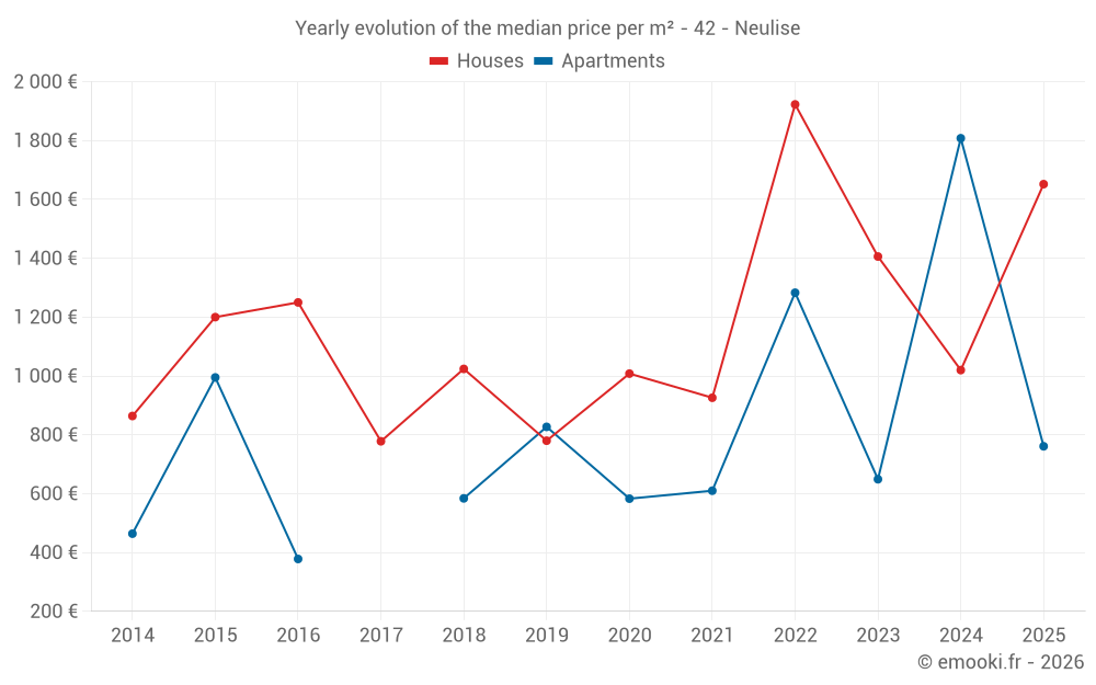 The median price on the 20 house transactions of the last 24 months in the municipality of Neulise was 1 148 € per square meter for a median property value of 131 750 €. Over this period, 60% of transactions were between 787 and 1 956 € per square meter (from the 2nd to the 8th deciles).