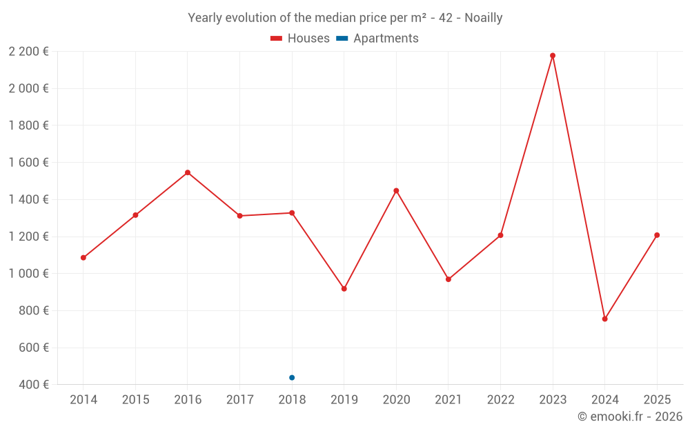 The median price on the 16 house transactions of the last 24 months in the municipality of Noailly was 1 627 € per square meter for a median property value of 148 775 €. Over this period, 60% of transactions were between 687 and 2 375 € per square meter (from the 2nd to the 8th deciles).