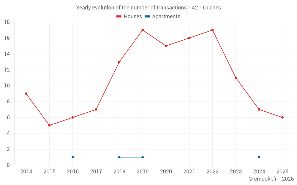The median price on the 20 house transactions of the last 24 months in the municipality of Ouches was 1 852 € per square meter for a median property value of 203 500 €. Over this period, 60% of transactions were between 1 499 and 2 283 € per square meter (from the 2nd to the 8th deciles).